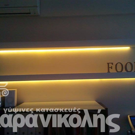 Κατασκευή διακοσμητικών δοκαριών για την τοποθέτηση σποτ, κατασκευή κρυφού φωτισμού, κατασκευή διακοσμητικών φωτιζόμενων ραφιών